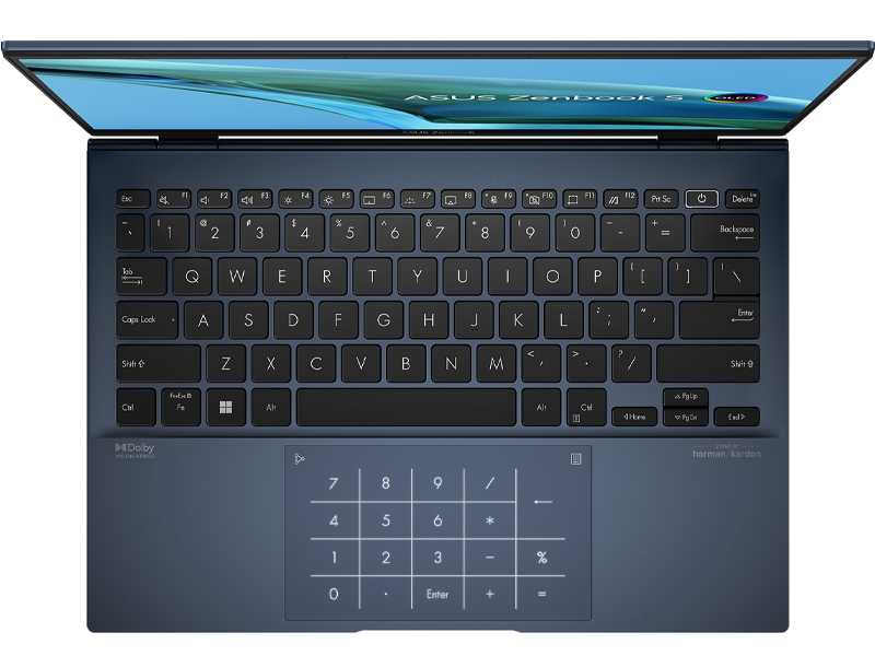 ASUS ZenBook S 13 OLED đã được hãng đầu tư sắp xếp một bố cục phím phù hợp. Bộ đèn nền hỗ trợ mọi thao tác làm việc bất kể trong điều kiện thiếu sáng. Thay vì sử dụng bộ phím đầy đủ với các phím numpad thì Asus đã tiết kiệm diện tích bằng cách tích hợp các phím số vào phần touchpad. Kích thước touchpad rộng rãi, khả năng chạm cực nhạy cùng bề mặt dễ dàng di chuyển tối ưu từng thao tác của bạn.
